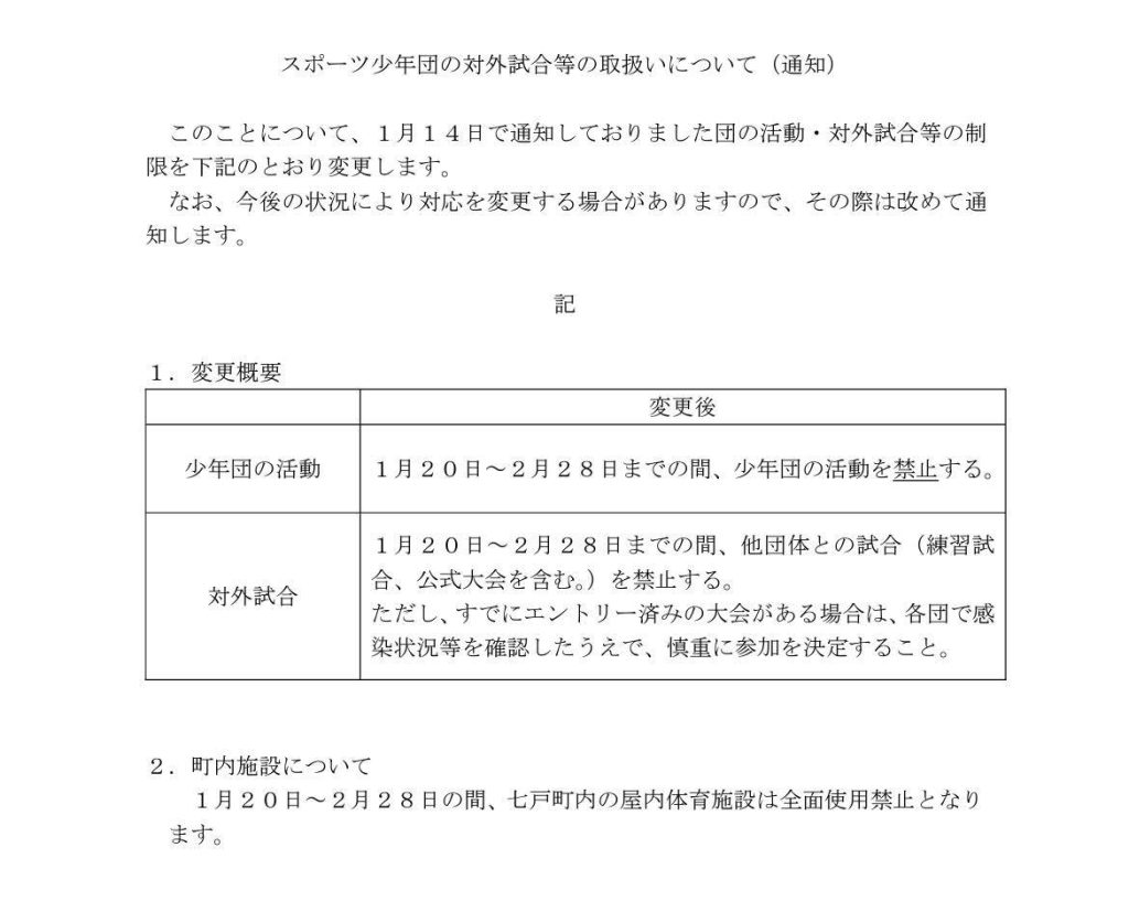 活動の禁止及び体育施設の使用禁止が自治体より通知されたことから、当面の間、活動を中止いたします。